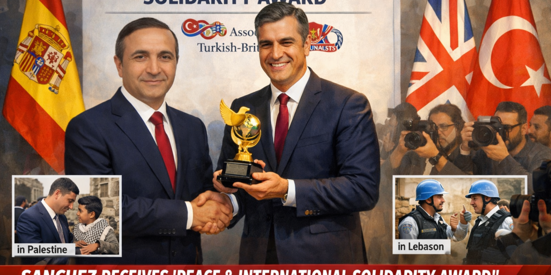 The Association of Turkish-British Journalists awarded Spanish Prime Minister Pedro Sánchez its “Peace and International Solidarity Award,” recognising his contributions to global peace efforts and humanitarian advocacy In an official statement, the ATBJ commended Sánchez for his commitment to diplomacy, international